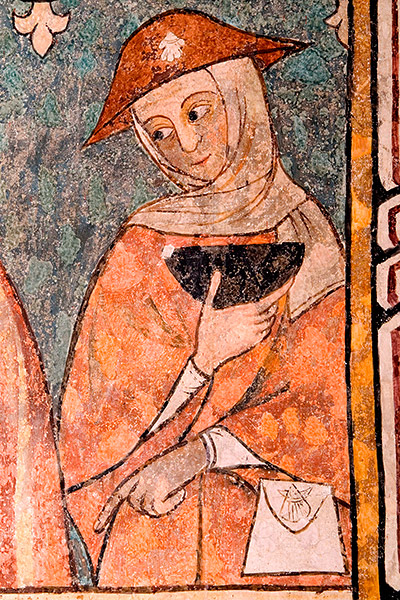 Peregrina con escudilla y conchas de peregrino en el sombrero y en la escarcela. Pinturas murales de la Edad Media de la Pia Almoina de la Seu Vella de Lleida. Imagen de https://www.turoseuvella.cat/es
