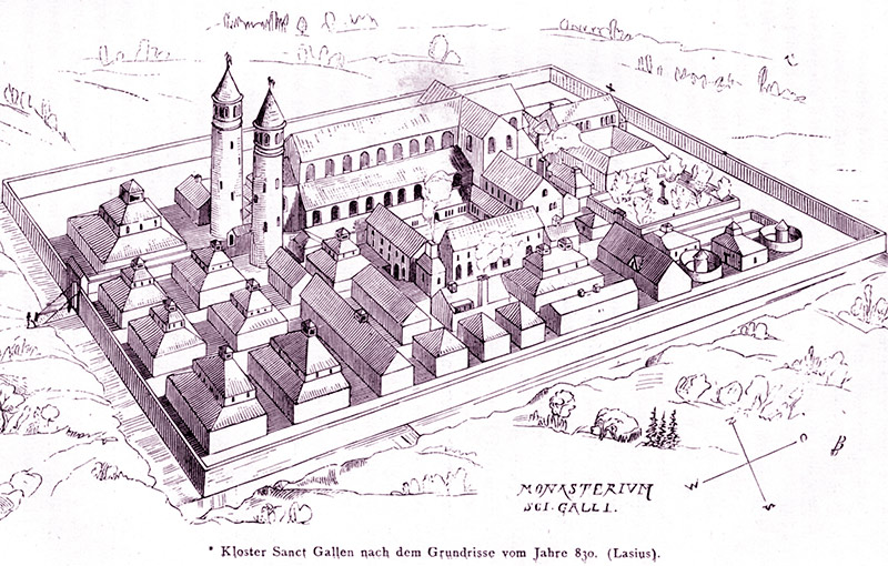 Fundado por un monje irlandés en el siglo VII, el recinto abacial de Saint Gall fue muy activo durante toda la Edad Media, aunque remodelado y saqueado en siglos posteriores. En la actualidad es un edificio tardobarroco, Patrimonio Mundial de la UNESCO. De las destrucciones y saqueos se salvó un plano, del entorno del siglo IX, en el que se refleja la disposición general del monasterio. Este semeja una pequeña ciudad en cuyo núcleo está el gran templo y su claustro, en torno al cual se ubican las zonas esenciales para la vida de los monjes.