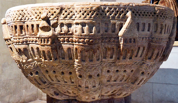 La bellísima pila bautismal de Redecilla del Camino semeja una ciudad amurallada, defendida por ocho torreones. Imagen de José Holguera