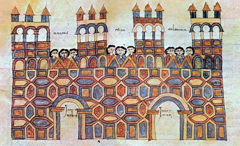 Construcción medieval reflejada en el Códice Emilianense, actualmente en la Biblioteca del Monasterio de El Escorial. Imágenes como esta pudieron inspirar al autor anónimo de la pila de Redecilla del Camino.