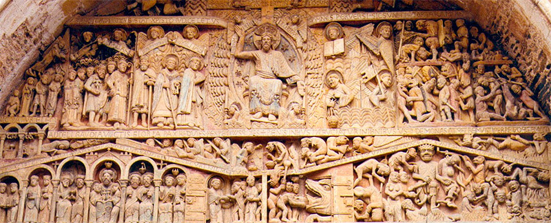 En la portada de Conques, descubrimos a la derecha a los justos gozando de la beatitud de la ciudad ideal, frente al caos y el sufrimiento destinado a los pecadores. Fotografía de Tomás Alvarez. Guiarte.com